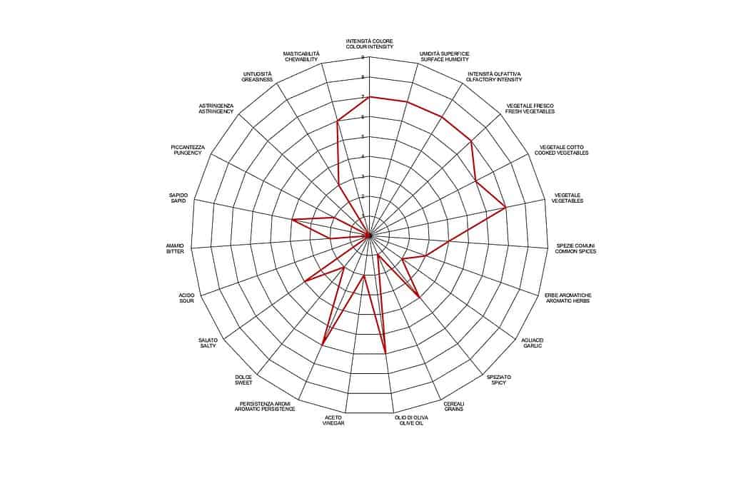 Zeppolone has a round shape and an intense green colour. Its high olfactory intensity is characterised by strong notes of extra virgin olive oil, vegetal notes of chicory and garlic, aromatic notes of mint, spicy notes of chilli pepper combined with hints of vinegar. The taste is harmoniously salty and savoury with balanced sweet, sour and bitter notes. Good consistency and aromatic persistence.