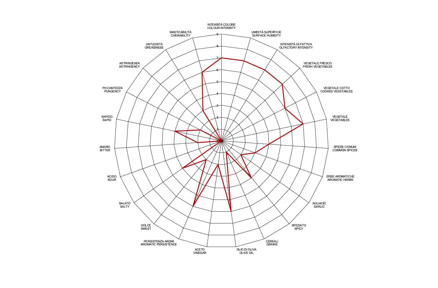 Zeppolone has a round shape and an intense green colour. Its high olfactory intensity is characterised by strong notes of extra virgin olive oil, vegetal notes of chicory and garlic, aromatic notes of mint, spicy notes of chilli pepper combined with hints of vinegar. The taste is harmoniously salty and savoury with balanced sweet, sour and bitter notes. Good consistency and aromatic persistence.