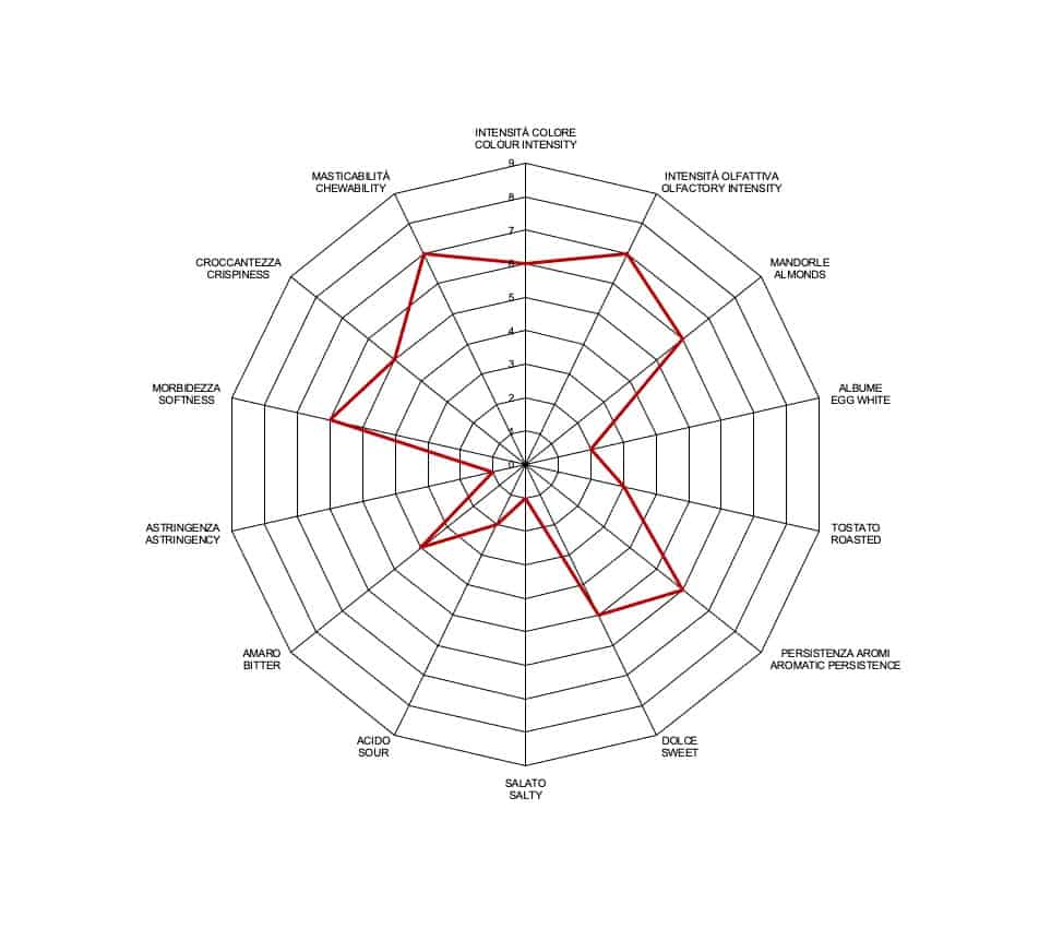 Amaretto di Guarcino, characterised by its elliptical shape, has a light brown colour tending towards hazelnut. The high olfactory intensity is characterised by notes of almonds and albumen combined with hints of toast. The taste is harmoniously sweet and bitter with a light salty and sour note. Crunchy and soft at the same time, it has a medium aromatic persistence.