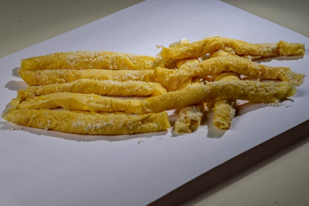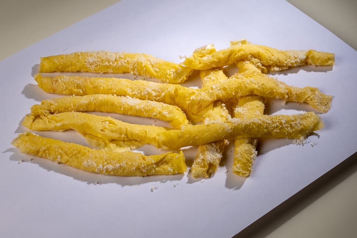 Frittellone, with its characteristic cigar-like rolled shape, has a golden yellow colour. The nose is characterised by pronounced notes of egg and cheese combined with hints of lard. The taste is moderately salty, with a pleasant sweet note. High smoothness and medium aromatic persistence.