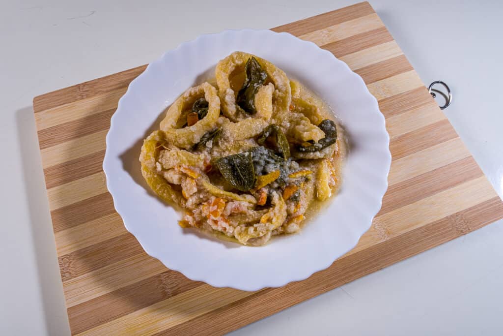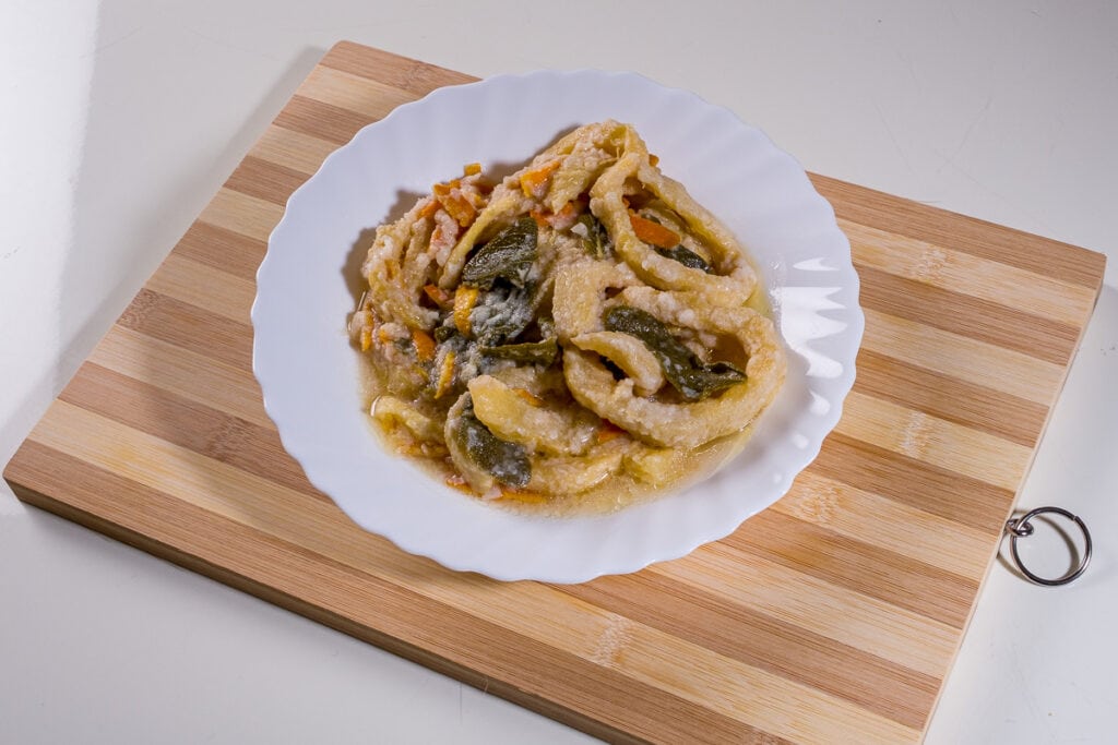 Nusche are a typical Christmas product of San Vito Romano, a staple in every kitchen in the town. The preparation is based on Roman courgettes and starts as early as the summer, leaving those that want to grow to the extreme to prepare the dish. Once picked, the pumpkin is cut into slices and put to dry in the sun through straws hung on balconies. Once dried, the pumpkins are stored until Christmas when they are soaked for a day and cooked in boiling salted water, then drained. Once dry, they are floured and fried, then marinated in a mixture of vinegar, citrus peel, mint, garlic and sage. After a few hours they are ready to be served.