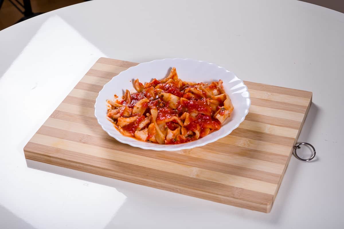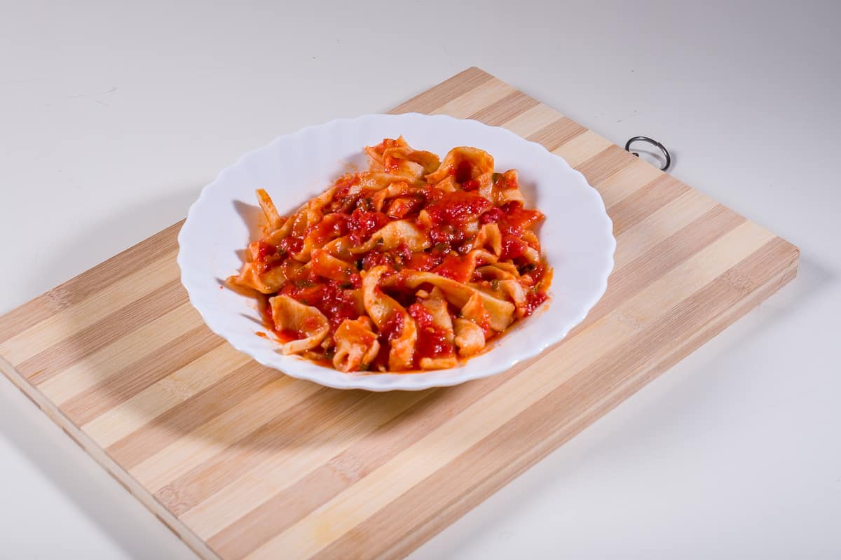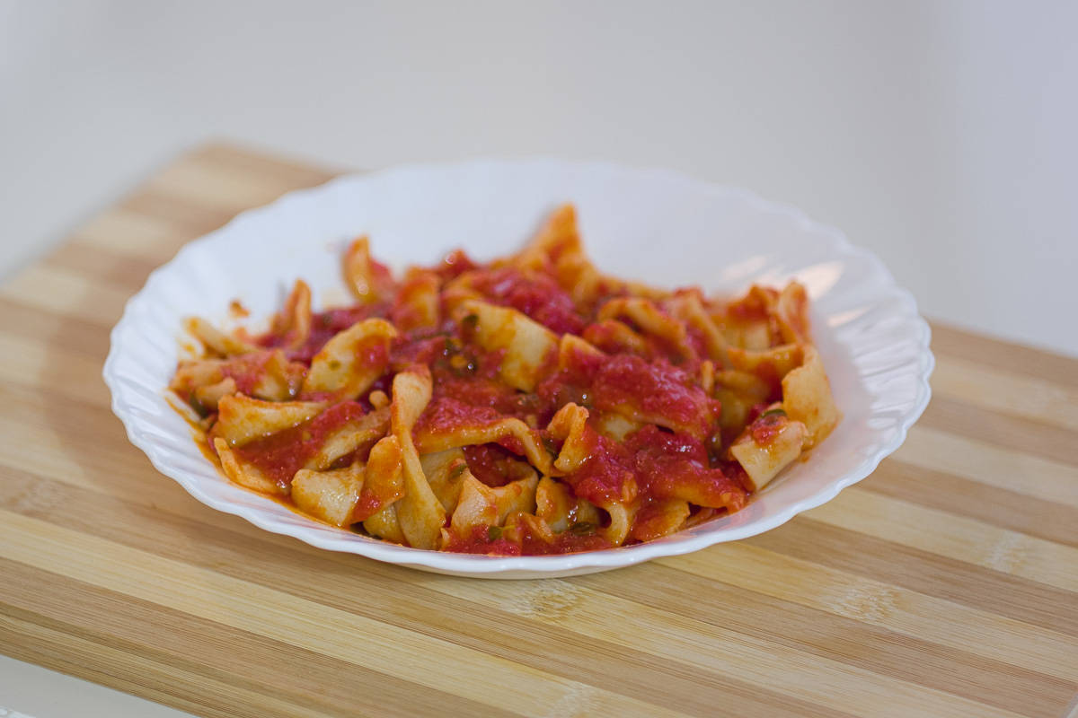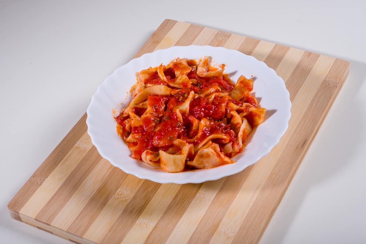 The origin of sagne alla molinara (or molenara in Civitese dalect) most likely dates back to before the foundation of Cittaducale in 1308. The middle Valle del Velino, from Antrodoco to Cittaducale, being very rich in springs gushing from the slopes of Terminillo, from Nuria, from Ponzano, from Colle Radicara, was also rich in water mills for grinding wheat. The miller, or molinaro, who was busy for most of the day and perhaps the night, had to provide for his sustenance with quick meals and, not having large spaces available, prepared the pasta without a rolling pin and knife, and then seasoned it with simple ingredients (oil, lard or grated lard). In later centuries, with the advent of chilli pepper and tomatoes, he would season them with sautéed garlic, chilli pepper and oil (or lard, guanciale or lard) but above all with tomato sauces, the recipe that is still made in the area today.