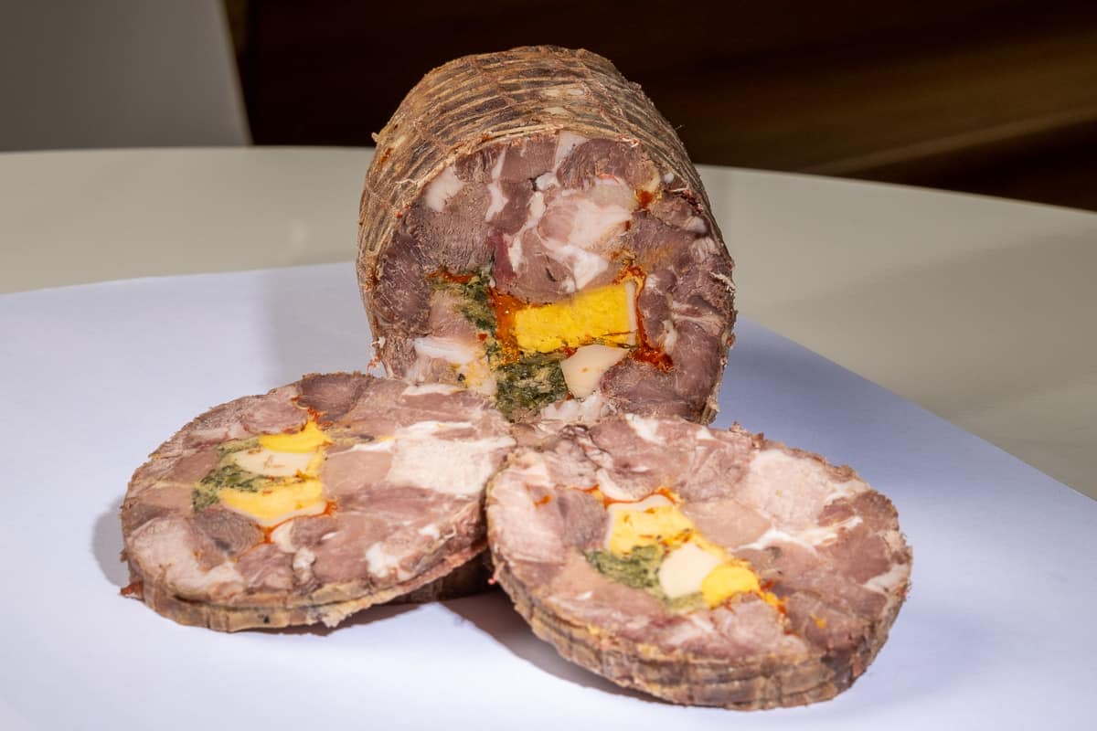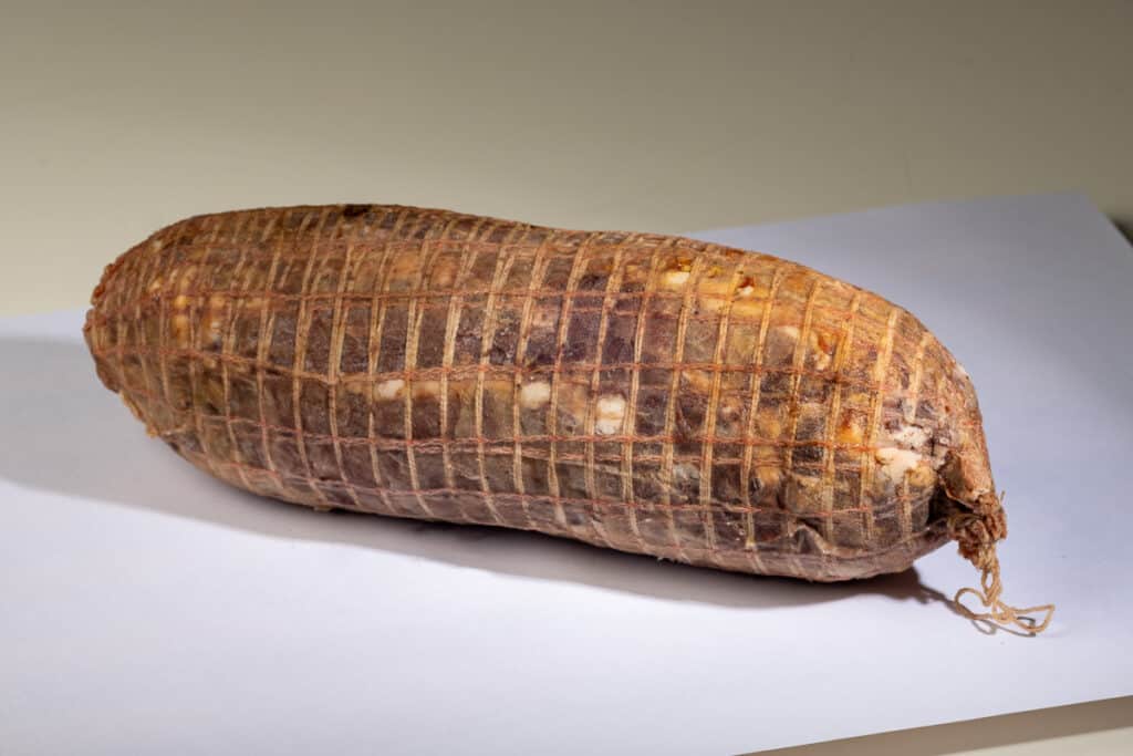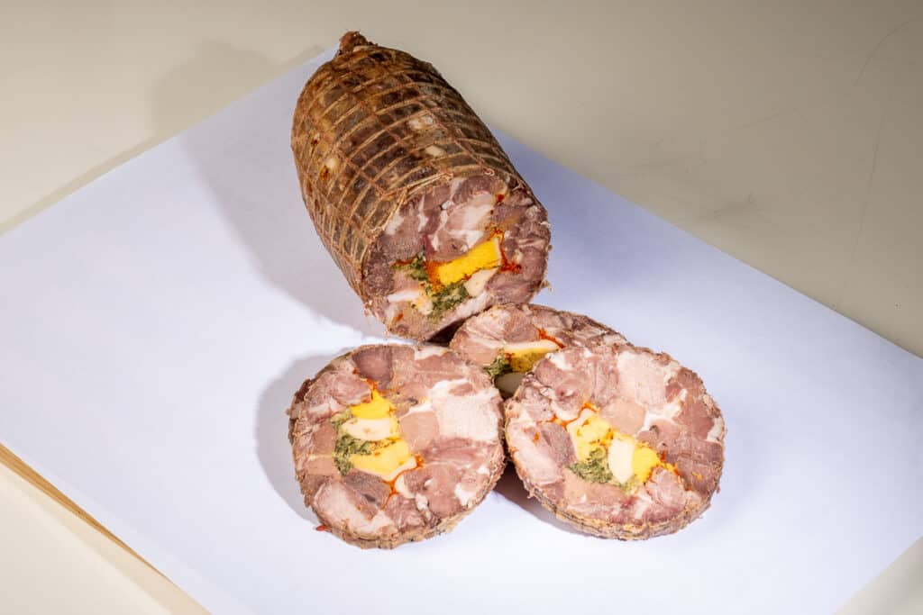The Abbuóto, with its characteristic cylindrical shape and wrapped in netting, has a fairly uniform brown meat colour with the clear presence of boiled eggs and spices. The high olfactory intensity is characterised by pronounced notes of cooked mutton and garlic combined with vegetal and vinous hints. The taste is harmoniously sweet, salty and savoury, with a slight sour, bitter and spicy note. Medium chewiness and aromatic persistence.