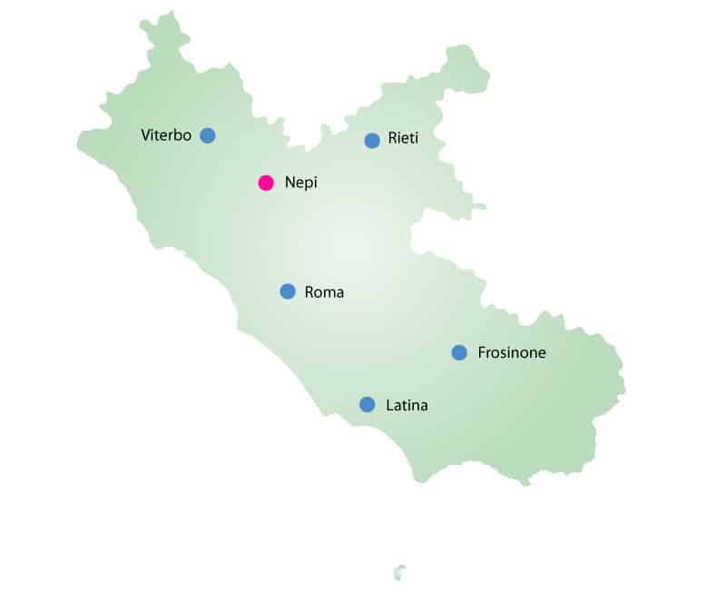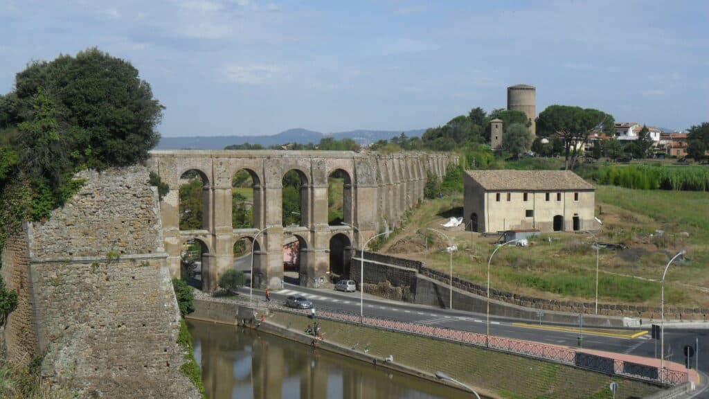 L’ingresso alla cittadina di Nepi è segnato dalla mole di un imponente acquedotto, realizzato con un sistema di grandi file di arcate su due ordini, che si erge grandioso per 285 metri fino ad appoggiarsi alle mura farnesiane. Nonostante l’aspetto richiami un’epoca antica, l’acquedotto fu progettato intorno alla metà del 1500 e costruito solo nel 1700. L’intento era naturalmente quello di portare l’acqua al centro abitato di Nepi. La maggior parte del tracciato dell’acquedotto correva sotterranea, ma in prossimità delle mura della cittadina il dislivello da superare era molto ampio. Per trovare una soluzione fu chiamato un team di architetti, tra cui lo stesso Giacomo Barozzi, detto il Vignola, che progettò l’opera ingegneristica. I lavori tuttavia furono portati a termine solo nel 1727 dall’architetto Filippo Barigioni, per volere del Cardinale Giuseppe Renato Imperiali. La bellezza dell’opera ha attirato l’interesse di vari artisti nel corso dei secoli. Nel 1828, durante il suo viaggio in Italia, il pittore inglese William Turner ha immortalato le arcate dell’acquedotto nei suoi schizzi. Il maestro Mario Monicelli ne fece lo sfondo delle prime scene del suo capolavoro L'armata Brancaleone e lo stesso acquedotto compare in alcune scene del film Per grazia ricevuta con Nino Manfredi, girato nel 1971. Ancora oggi la struttura perfettamente funzionante alimenta le monumentali fontane cittadine e si fa ammirare dal visitatore moderno.