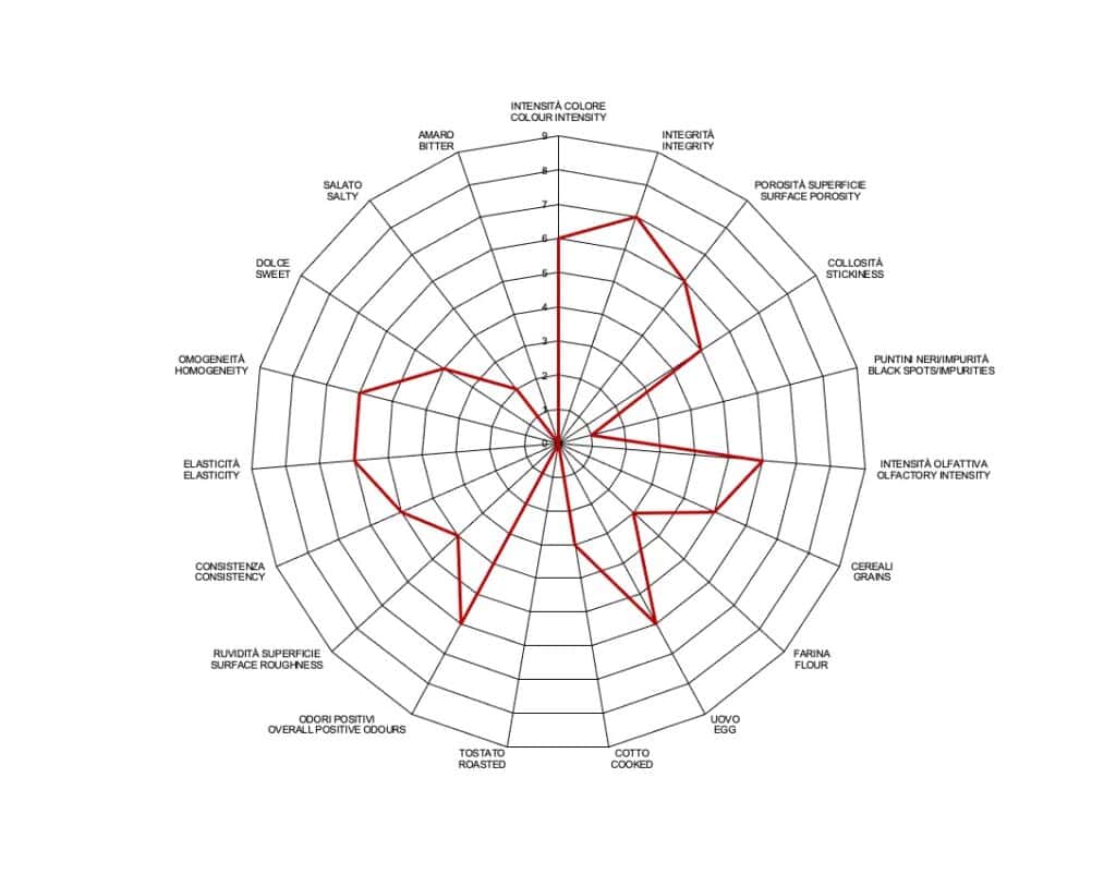Lo Stringozzo talocciano ha un colore giallo paglierino mediamente intenso ed omogeneo e si contraddistingue per l’alta integrità dopo la cottura. L’elevata intensità olfattiva si caratterizza per le note di cereali, farina e uovo. Al gusto si presenta armonicamente dolce con una leggera nota salata. Buona la consistenza e l’elasticità.