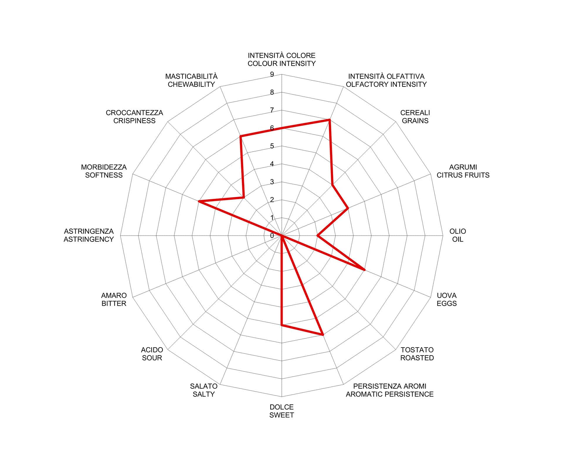 La Ciambellina della Domenica delle Palme, contraddistinta dalla forma rotonda, ha un colore ocra uniforme. L’elevata intensità olfattiva si caratterizza per le pronunciate note di limone e uovo, abbinate a sentori di olio e di cereali. Al gusto si presenta dolce. Croccante e morbido al contempo, ha una media persistenza aromatica.