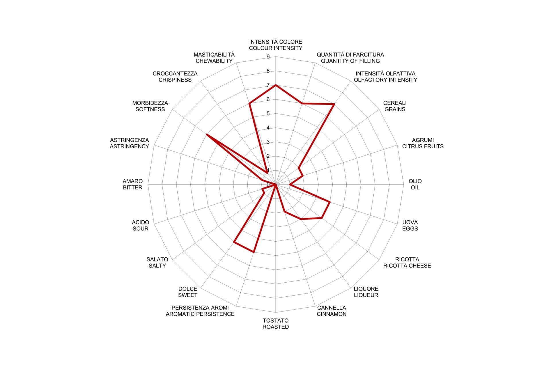 Il Tortello ha un colore giallo dorato intenso. L’elevata intensità olfattiva si caratterizza per le pronunciate note di uovo, di ricotta e di rum, abbinate a sentori di limone e di cannella. Al gusto si presenta dolce e con una leggera nota acida. Buona morbidezza e media persistenza aromatica.