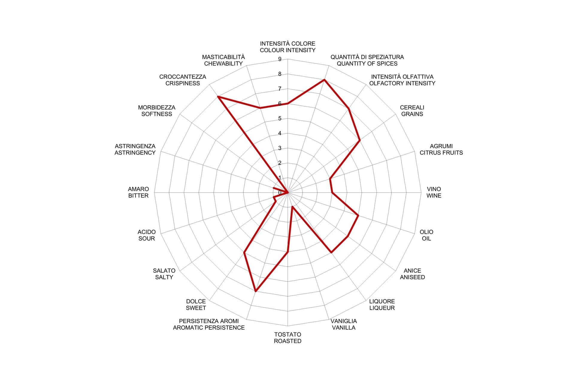 La Ciambellina al vino, contraddistinta dalla forma rotonda e dai granelli di zucchero cosparsi sulla superficie, ha un colore nocciola. L’elevata intensità olfattiva si caratterizza per le pronunciate note di cereali, anice, liquore e olio, abbinate a sentori di limone, vino e vaniglia. Al gusto si presenta dolce. Buona croccantezza e persistenza aromatica.